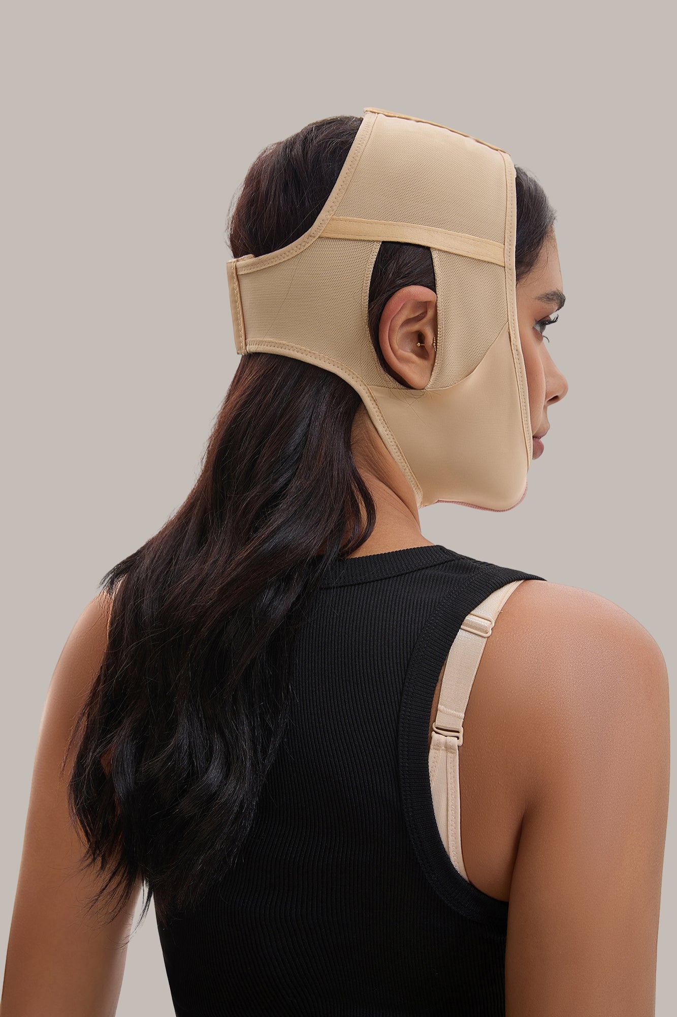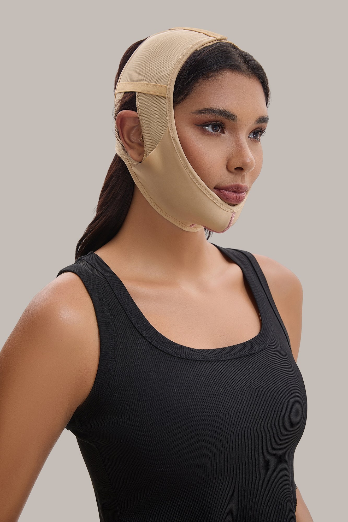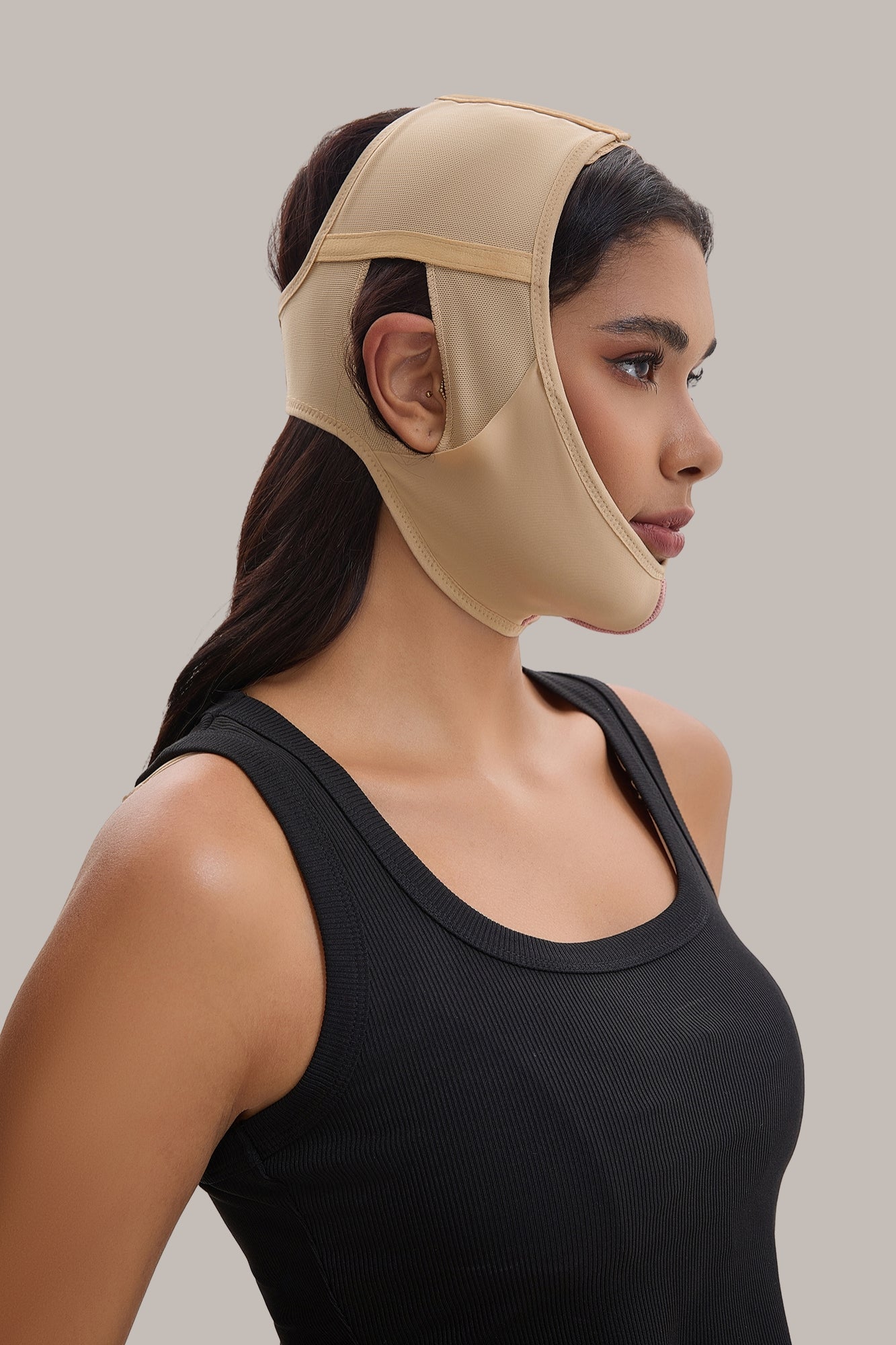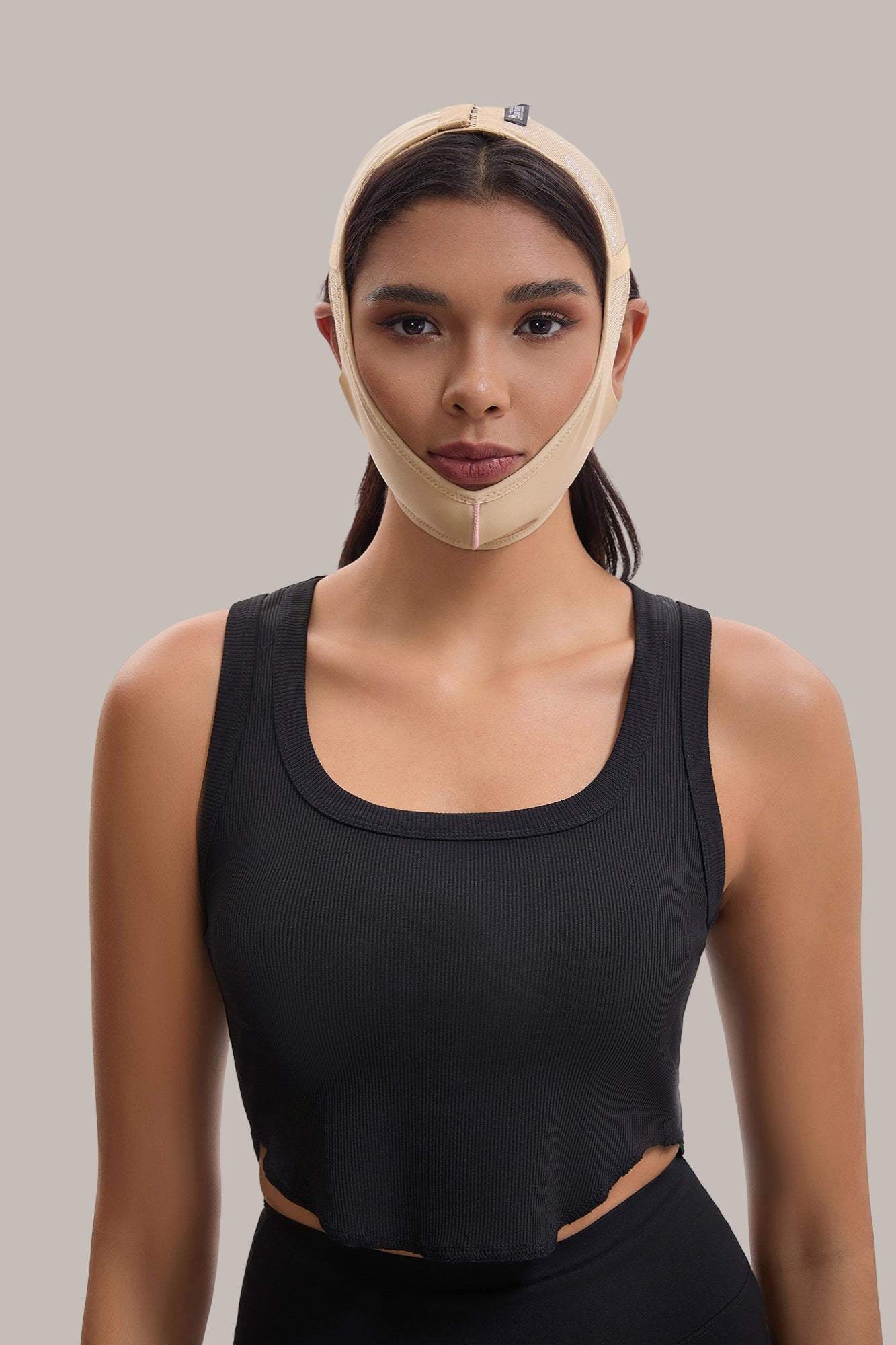Mască facială postoperatorie pentru zona bărbiei, cu buzunar pentru punga de gheață. Ideală după liposucția gușii sau lifting facial, oferă compresie uniformă, reduce inflamația și ajută la definirea conturului feței. Recomandată de medici esteticieni din Columbia și România.