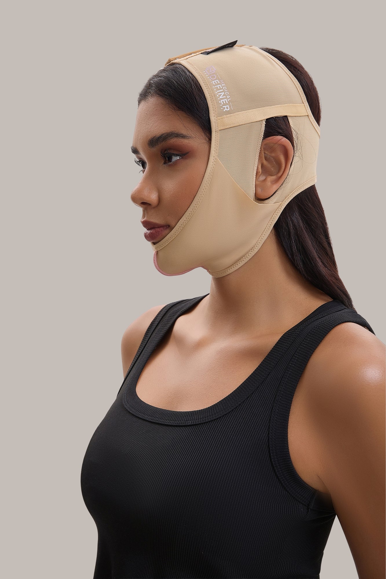 Mască compresivă postoperatorie Medical Definer – creată pentru susținerea și remodelarea conturului facial după intervențiile de liposucție a gușii, lifting facial sau bichectomie.